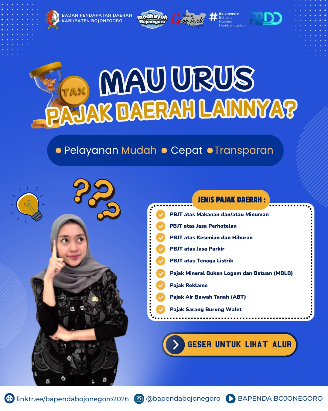 Badan Pendapatan Daerah (Bapenda) Kabupaten Bojonegoro terus meningkatkan pelayanan kepada masyarakat dalam pengurusan Pajak Daerah Lainnya (PDL). Kini alur pendaftaran dan pelayanan pajak daerah telah dibuat lebih jelas dan mudah diikuti.